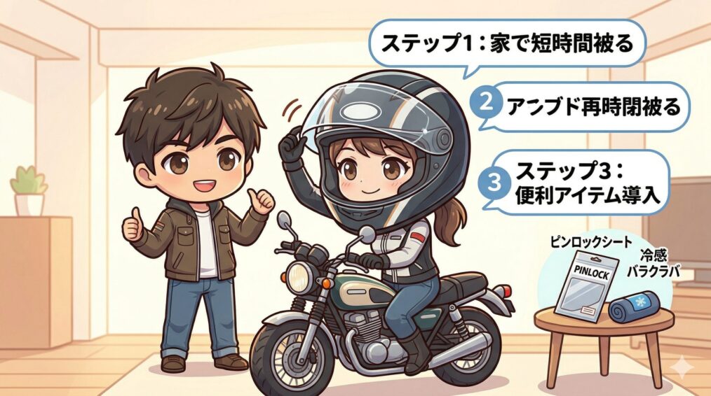 自分のペースで少しずつ慣らし、便利アイテムやヘルメットの買い替えで賢く対策する