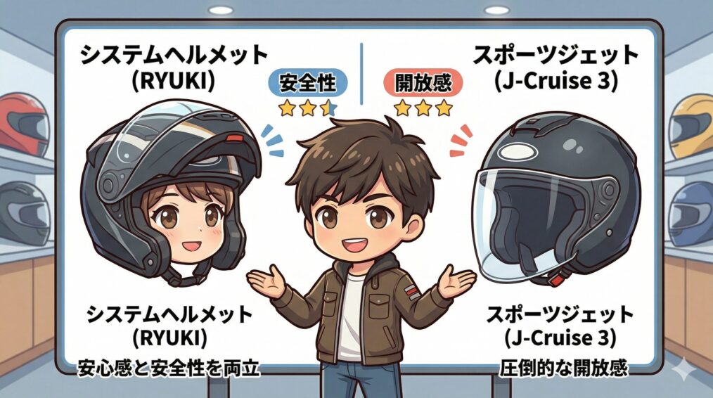 OGKカブトの「RYUKI(システム)」や、SHOEIの「J-Cruise(ジェット)」などは、機能性が高くデザインもスタイリッシュで大人気です。ぜひ、あなたに合った「安心できる相棒」を手に入れて、快適なバイクライフを取り戻してくださいね!