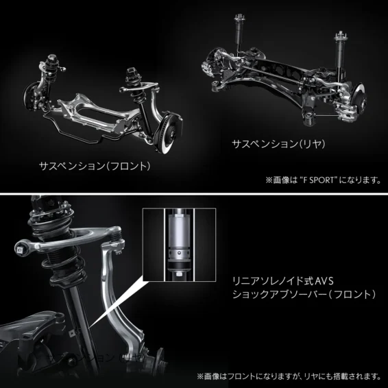 足回りには、リニアソレノイド式の「アダプティブ・バリアブル・サスペンション(AVS)」が採用されています 。路面からの入力に対してダンパーの減衰力をミリ秒単位で連続可変させることで、コーナリング時のロールを極限まで抑えたフラットな姿勢と、日常使いにおけるしなやかな乗り心地という相反する要素を高次元で両立させています 。さらに、F SPORTハンドリングパッケージ装着車には、コーナー立ち上がりでの強烈なトラクションを保証するトルセンLSD(リミテッド・スリップ・デフ)が搭載され、FRレイアウトならではのアクセルによる姿勢コントロールの醍醐味を味わい尽くすことが可能です 。